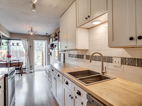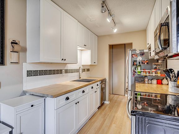 Special opportunity for simple condo living. This unit has its own private entrance and a private enclosed outdoor patio space. Wonderful main floor unit with wood burning fireplace, updated kitchen with butcher block countertops and stainless appliances. Newer flooring, modern bathroom with dual vanities, updated lighting throughout, and sliding barn doors on the closets. Smart use of the space makes the