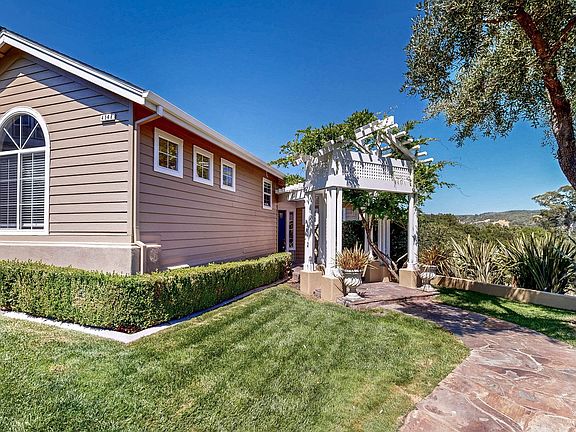 Through a gated driveway as well as gated yard entry, this property boasts a blend of newly refinished hard wood flooring and new carpet. The home has been freshly painted inside and out and features new air conditioning and forced air heat. The large primary bedroom has a fireplace and is a luxurious retreat with a large walk in closet with windows to allow for ample light. Ensuite with a large tub , double sinks and shower stall. There is a second cozy primary suite on the opposite side of the home, along with the other two bedrooms that share a jack and jill bathroom. The kitchen is equipped with a new refrigerator and new a wine refrigerator, Gas stove top, built in dishwasher and dual oven. The kitchen opens to your large living room with fireplace and breakfast nook perfect for the hosting. The home also offers a designated office space with lovely french doors, built in desks and filing cabinets and a sliding glass door leading to a Juliet balcony over looking the hobby vineyard making work from home a true luxury. The grand living room with the last of three fireplaces, creates a warm and inviting atmosphere. The main floor laundry room adds convenience, and the washer & dryer hookup is ready for your appliances. The dining room with custom "heavenly" muraled ceiling is perfect for hosting dinner parties or holidays. The new large redwood deck and private yard space offer additional space for outdoor entertaining. With a 3-car garage there is ample storage with its built in cabinets and plenty of parking spaces inside and out. Two additional closets under the home offer a great place for your storage needs. This home is a perfect blend of luxury and convenience, waiting for you to make it your own.