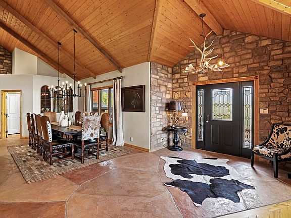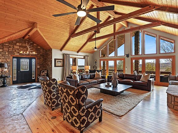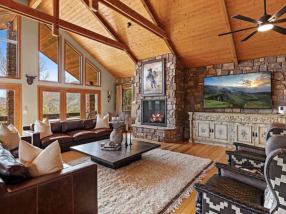 This breathtaking house offers unparalleled views from every corner. Step into the stunning great room, featuring a majestic stone wall and a grand fireplace, where every glance offers a picturesque vista. The open-concept kitchen has stainless-steal appliances and custom cabinetry, while the dining area seamlessly integrates with the panoramic surroundings.