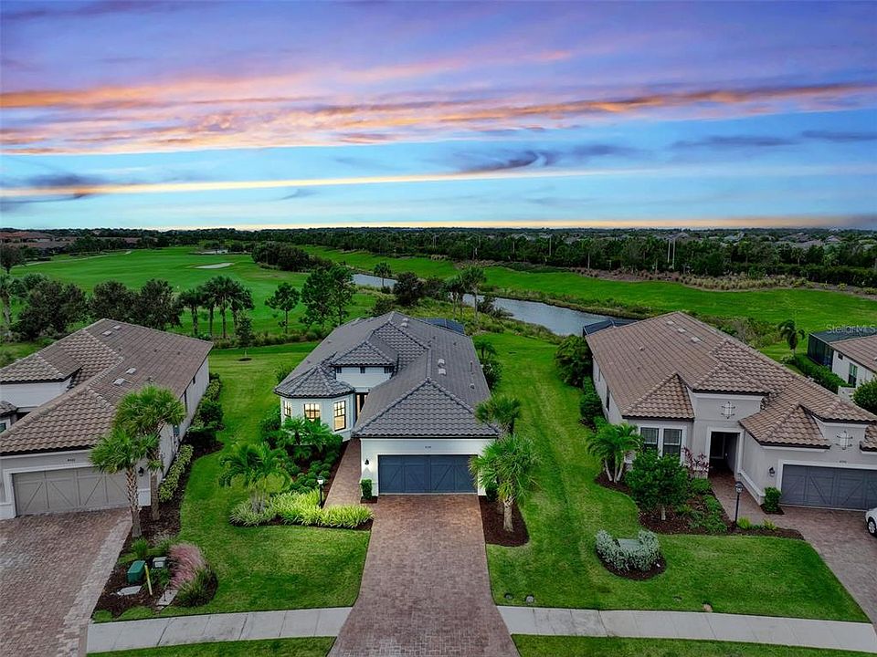 Highly desired resort-style living of Esplanade Golf & Country Club in Lakewood Ranch. Behind the gates of the master-planned Taylor Morrison's lush landscaped community, you will find this meticulously maintained Farnese model home. Enjoy the privacy of the 3 ensuite bedrooms and extra powder room. This open floor plan is spacious with 10’ ceilings and 8’ doors throughout. Light and bright with a SW facing lanai. Office/den has Custom built in shelving with movable ladder and closing French doors. GAS COOKING- kitchen equipped with GE Café stainless steel appliances and Bosch stainless steel refrigerator. Beautiful quartz kitchen countertops/island with self-closing white wood cabinets & pull-out drawers. Whether you are enjoying a nighttime cocktail by the custom saltwater pool and spa with flowing water feature or watching the sunset overlooking the serene views of the pond and the 11th green or out playing on the 18-hole championship golf course you are sure to be in paradise without leaving the community. The extended lanai and outdoor kitchen with stacked stone and granite countertop , stainless steel gas grill, sink and refrigerator sure makes it very enjoyable to entertain. Maintenance-free lawn care included. Golf is included in HOA fee. This home is loaded with UPGRADES- Hurricane windows & doors, oversized private lot, 3 car tandem garage with epoxy flooring, pocket sliding glass door, tray ceilings, recessed lighting, custom trim, molding, closets and laundry room, power Lanai sunshades, beautiful screened – in- panoramic view lanai and more. Some of the community features include- a resort style pool, Tiki Bar, Culinary Center, two fitness centers, full-service spa, tennis courts, pickleball courts, bocce ball courts, two dog parks, and a full-time lifestyle director. If you are looking for carefree living in Paradise, look no more .