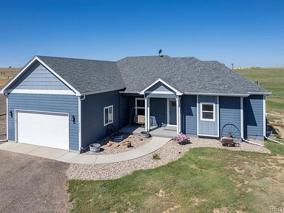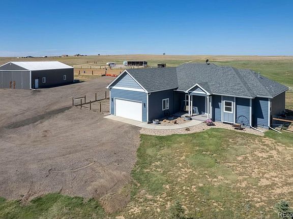 LOVE WHERE YOU LIVE on this luxurious Colorado horse property ranch on 35 sprawling acres w/ privacy, peace, tranquility & affordability ALL IN ONE! Wolf Creek Ranches retreat built 2018 & perfect for AG, farm, animal & self-sustainability enthusiasts complete w/ concrete safe room. Move-in ready w/ newer open concept home incl stunning kitchen (slab granite, SS appliances & hardwood floors). Primary suite w/ spa-like 5 piece bath, huge closet with built-ins & sitting bench & window. Mountain views to enjoy from every room & outside on extended covered patio. HE furnace w/ humi & GE water softener, 1,000 gal buried propane tank.Denver Aquifer well for extensive 3 acre-feet watering including livestock, 3 single family homes! 2nd AG well is also allowed from Arapahoe Aquifer. Perfect lot for ADU, compound or multi-generational living. 2,240 SF shop (40'X56') with 50 & 30 amp RV hookups & 14’ high x 20’ wide door & circle drive. 3 stall (with space for 4) lean-to style barn w/ hay storage, feeding area, turnouts & automatic waterers. 2 fenced pastures & horse safe fenced 100x200 arena w/ sand base. Enjoy trail riding right on your own fully fenced property w/ separate fenced dog run & electric entrance gate. Private firing/archery range (75X35 yards w/ 26’ back stop). Meadows Market (food, liquor, gas) just 10 min. Blackstone Golf Course 26 & Southlands Mall 33. Shopping, schools, amenities Kiowa 18, Bennett 25, Elizabeth 28, Parker 30. Elbert County Fairgrounds 18, DTC 40 and DIA 50. High speed WiFi. Conveniently located just a short hop off paved roads. Unbelievably low taxes 58 mills & NO HOA. Chickens pigs, llama, alpaca, cattle, horses all welcome here! This estate offers unparalleled comfort & convenience for both you & your animals. Brand new $55million dollar K-12 school coming soon! See agent's website for more info & drone video! NOT EVEN CLOSE TO future XCEL power pathway for 200' power lines.