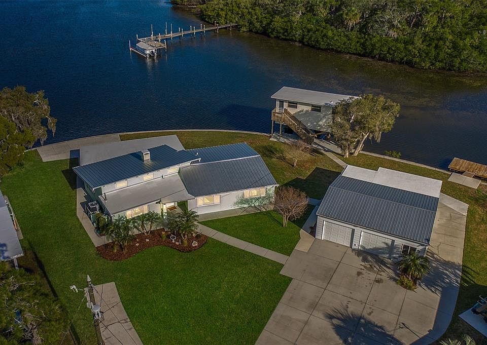One or more photo(s) has been virtually staged. Back on market! Priced below appraised value of $1.1M! Here is your chance to own a piece of paradise. You have found a gem with this completely unique waterfront property. The main house is a gorgeous 3 bedroom, 2 bathroom waterfront mid-century modern home which was fully remodeled in 2016/2017 from top to bottom to include a New AC, New metal roof, updated plumbing, and electrical system. All new PGT hurricane impact windows and entry doors. New gutter system on all the buildings that drain underground through seawall. New tile throughout the home and carpet in two bedrooms. The unique overhead ambient lighting looks like a cloud floating overhead in living room which creates such an awesome ambience even more when you have the fireplace going. The kitchen is stunning with Cambria quartz countertops, modern cabinets full of storage options, drawers, a deep Moen sink, new appliances from LG and Bosch. Both bathrooms have been completely remodeled from floor to ceiling. The primary suite has endless views fit for a king and queen not to mention a bathroom with a full glass curbless walk-in shower with specialty tile. The air conditioned patio is built to enjoy the spectacular sunsets while watching the birds and boaters. There is an oversized 2 car metal garage with workshop (29’ 5”x 23’ 6”) that has it’s own main electrical box 120/240 AC. Tons of LED lighting and a 8x25 workshop with work bench make it a great space for anyone who likes to tinker in the garage. Directly behind the garage is a great area for gym or in law suite. It also has new Roof, new AC, and fully insulated space. It also has new lighting, new hurricane windows and gym flooring ready for just equipment. Next to the gym or in law suite you will find the laundry, storage area. Plenty of space for washer/dryer or can convert to a bathroom if so desire. Did I mention a super duper bonus space of 550 sq foot remodeled bungalow style boathouse? New roof 2021, new kitchen cabinets and appliances completed in 2024. New vanity, flooring installed in December 2023. This would make the perfect rental for short term or long term. The views are legendary with the gulf and spectacular sunsets that anyone would enjoy. This property is set up as a boaters dream with the boathouse space, a floating dock, and a custom kayak rack that holds 6 kayaks on. The property boasts all new driveways, sidewalks, patios, and security motion detectors on all the structures. You are minutes from Green Key Beach, Anclote Island, and the open Gulf of Mexico with no bridges or other obstructions. The opportunities are endless on this double lot with 240 ft of seawall, three structures, and the possibility of multiple income streams. ****Owner Financing Available****