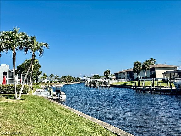 Covered parking and exterior storage closet. Primary suite is spacious with water views and access to lanai. Laundry room is adjacent to kitchen with Washer & Dryer. New Roof 2024. AC 2022. Roll down hurricane shutters on the lanai. With gulf access, you will have opportunities for your boating adventures. This 55+ community is located in the heart of Cape Coral. Community has a clubhouse, pool and dock areas. Located in a prime downtown area with easy access to plenty of dining, parks, shopping, entertainment and nightlife. Welcome to Paradise!