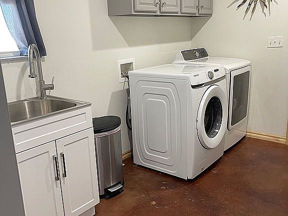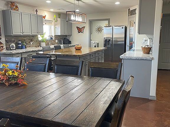 Steel metal home open concept with 3 bd 2.5 bathrooms, attached 2 car shop, beautiful stained concrete floor, 10x55 front & back porch, 12x12 storage building, with a pond on 6 acres with an amazing view of the mountains.