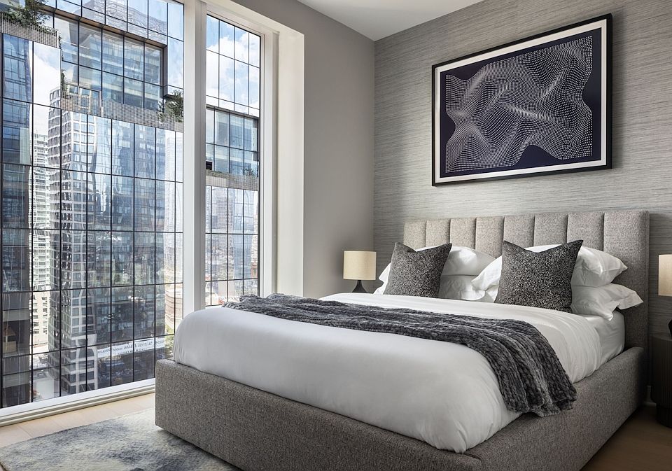 This fully-furnished and fully-serviced 1 Bedroom, 1 Bath is designed in a rich color palette of blues and grays with dark finishes. The L-shape kitchen is equipped with Brazilian marble countertops, full-height backsplash, Wolf induction cooktop and speed oven, and a high-top dining table that doubles as a kitchen island. The cozy bedroom features a queen-sized bed and a customized closet. Complete with floor-to-ceiling windows, Miele W/D, and voice-controlled smart home technology, as well as distinctive services such as weekly housekeeping and room service from the on-site restaurant.