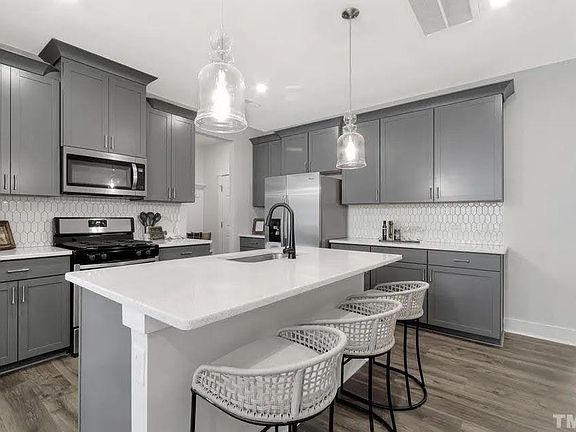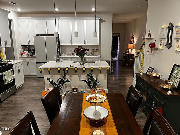 Live in style at Roberts Crossing, a quiet and modern townhome community located right on the border of Cary and Apex. This 4-bed, 3- full bath townhome is less than 2 years old and offers smart home features, a decked backyard patio with pond view, and a dedicated office perfect for remote work. 1st floor guest suite, spacious kitchen with large Island, quartz countertops, 42'' cabinets, and tile wall backsplash. Hard-surface floors throughout entire first floor! . Smart thermostat, refrigerator, washer & dryer, garage opener, whole-home water softener & filter, fully built out closets in 2 bedrooms,, Minutes to Beaver Creek Commons, Costco, Aldi, Home depot, Target, Lowes and easy access to Hwy 55, 64 and 540.