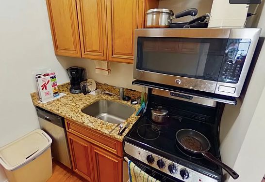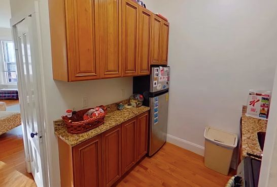 Elegant brownstone with grand mahogany stairwell that says "welcome home". Unit has enormous living room with original hardwood floors, renovated kitchen, and a bedroom can fit a queen. Third floor, south facing windows grants you a nice view of the Prudential Center and Boston skyline. Heat and hot water included. Laundry on site.