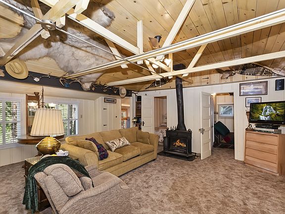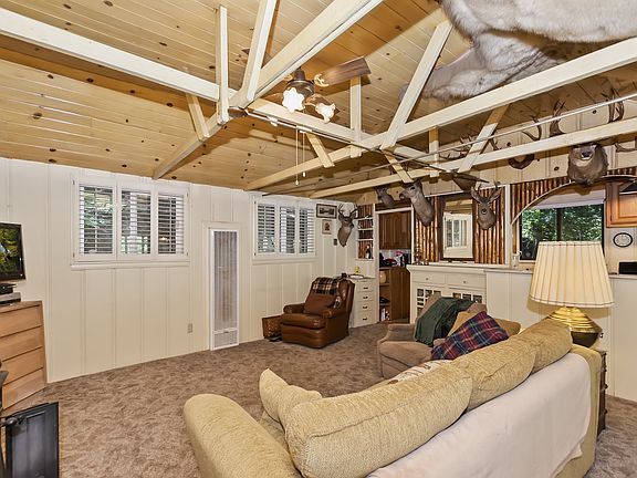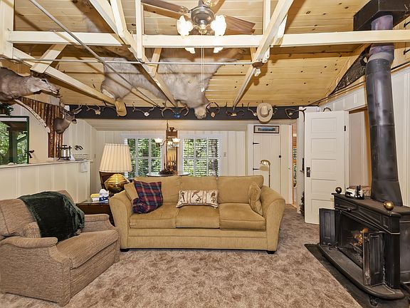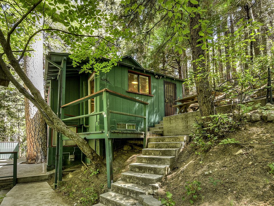 Charming vintage cabin in desirable Blue Jay Canyon! Escape to the mountains and relax to the sound of nearby stream on one of the large patios surrounded by beautiful Dogwoods and Pine Trees. This two bedroom cabin features a galley kitchen that opens to cozy living area with vaulted ceiling, wood stove, charming built ins, shutters on windows and a sleeping loft. Lots of potential to improve the unfinished buildup (accessed off lower patio) which has an additional bathroom and laundry area.