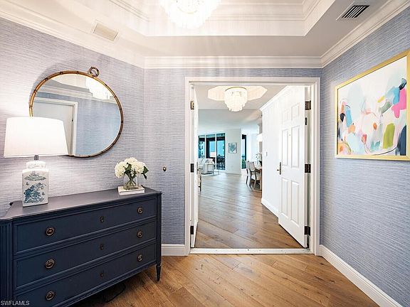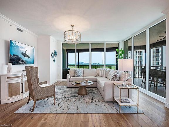Never again miss a sunset from this newly renovated and rarely available 04 unit on the 9th floor in Nevis at Cove Towers. This move-in ready residence boasts 3 bedrooms plus a den, 3.5 baths, and an open floor plan that seamlessly connects the interior to an expansive lanai, offering 180° Bay & Gulf views, including the new Kinsale golf course. Offered furnished with a brand new furniture package, the interior features brand-new light oakwood flooring, stainless steel appliances, new quartzite kitchen counters, exquisite new chandeliers and fans, fresh paint, new baseboards and moldings, and a new HVAC system. Access is via a private elevator that opens directly into the spacious living area, complemented by a secure gated garage. The exclusive Calypso Club provides resort-style amenities such as a pool/spa, exercise room, gas grills, and guest suites. Upon closing, the buyer pays a one-time $8,750 Transferable Membership fee for the Tarpon Cove Yacht & Racquet Club, which offers a full-service restaurant, tiki bar, newly constructed tennis courts, and pickleball. Ideally located, this property is just minutes from Mercato and Waterside Shops, and a short drive to 3rd St S & 5th Ave S, where you can enjoy fine dining, world-class shopping, and pristine white sand beaches.