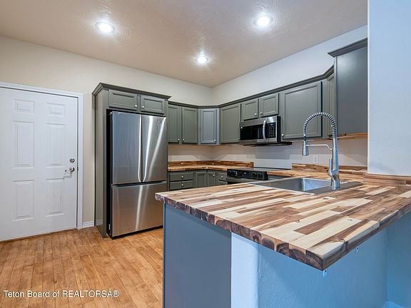Newly remodeled in 2024! New flooring throughout, new counters, new appliances, new paint etc. This well located townhome sits in a quiet, beautifully landscaped community with easy access to Driggs and a community pathway along Teton Creek! Hardwood flooring in the kitchen, butcher block counters, and a wood burning fireplace give a quality feel to this well located unit. Enjoy the freedom of townhome living. The HOA covers exterior maintenance, landscaping, and plows your driveway in the winter. Enjoy the convenience of a quick trip to Grand Targhee whether you are driving or taking the shuttle! A bike path takes you into town to enjoy shopping and local restaurants! Virtually staged photos in listing to give ideas on furniture placement.