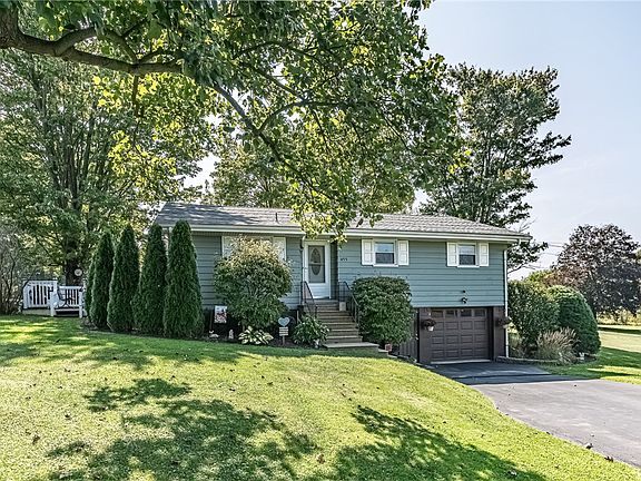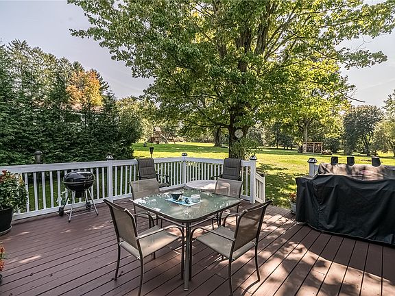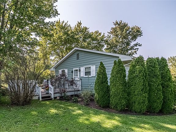 You will fall in love with this meticulously maintained ranch home perfectly situated on a gorgeous (almost) 1 acre lot. The serene setting features easy-maintenance landscaping & a lovely, oversized deck perfect for gatherings or family dinners. The foyer welcomes you inside to the eat-in kitchen with white cabinetry, tile flooring & black cast iron sink. Cozy up for movie night in the living room with solid hardwood flooring, wood burning stove & picture window. Three spacious bedrooms with ample closet space & a full bath complete the main level. Downstairs you'll find a fantastic game room (currently being used as a bedroom) with convenient half bath. The oversized laundry room features plenty of storage as well as a cool dog-wash station with ramp & dryer. More storage space is located in the deep garage with generator hookup. Additional features: newer windows, blown in attic insulation, plaster walls, paved driveway and reverse osmosis water filtration system. Super LOW TAXES!