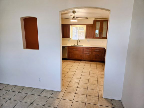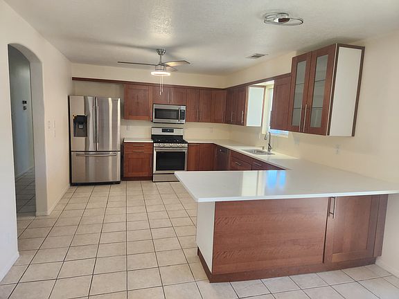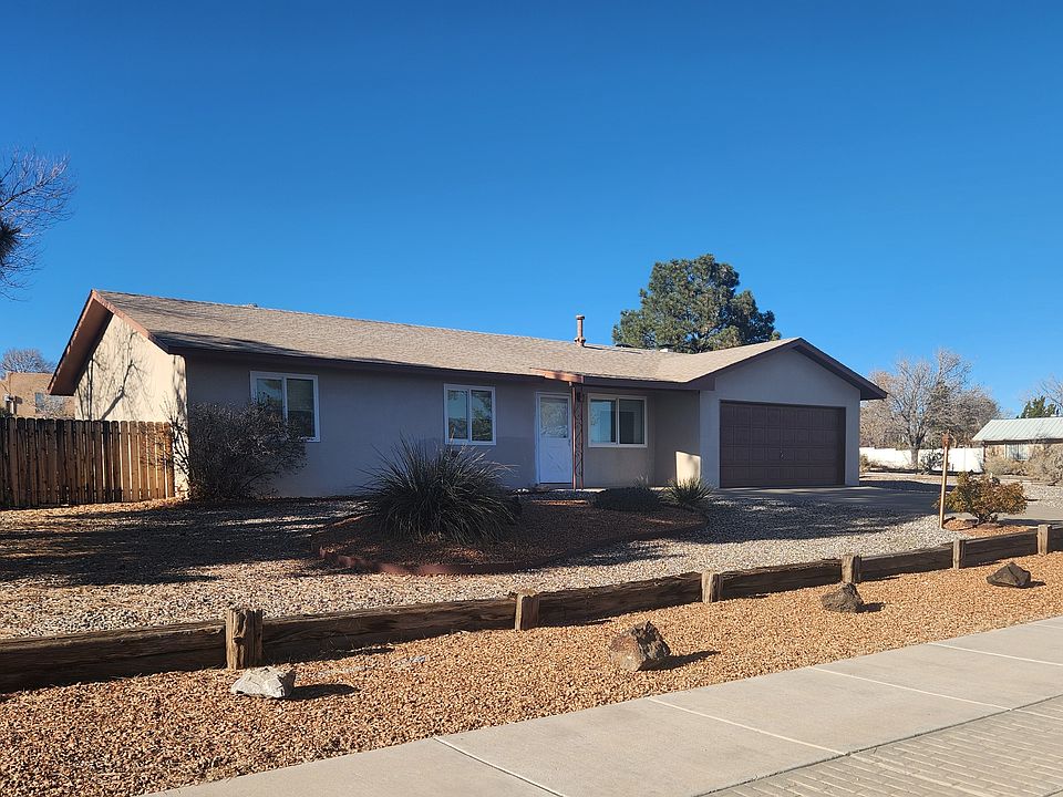 Enjoy a beautiful view of the Sandia Mountains in a quiet neighborhood in this nice three-bedroom home. This single-family home includes two bathrooms with a large double car garage and zero scape rock yard--easy for renters to upkeep. The entire house is tiled, so it is also simple to maintain. The kitchen has brand new appliances and gorgeous new cabinets with an eat-in island and plenty of storage. There is a wood fireplace in the family/kitchen area. The back yard has a semi enclosed patio. All of the rooms have fans. The Master Bathroom has a walk-in shower and the hallway bathroom has a shower-tub. All of the windows and doors are new. The bedroom closets have lights. The sliding glass door off the great room has built in shutters which open and close for privacy while the other windows all have exterior blinds for privacy. The house is easily accessed through the double car garage. The garage has a large storage shelf. The front door has a storm door which can be locked. One Year