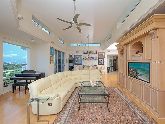 AWC - Taking Backup Offers The enormous panoramic views will captivate you from this spacious penthouse at The Pierre! Floor to ceiling windows showcasing the City of Sarasota and the John Ringling Bridge, Sarasota Bay, Longboat Key Club Island side golf course, and the Gulf of Mexico. You'll enjoy both sunrise and sunset views! The main living area is open and loaded with natural light, and accesses two flanking terraces. Ceiling heights begin at 12' and soar to 22' in the great room. The generous master suite offers two walk in closets and deluxe master bath. Two additional en-suite bedrooms are located on the opposite side of the unit, affording comfortable privacy. Two parking spaces are included. Pierre residents enjoy the attention of a 24 hour concierge, and amenities such as gulf-front heated pool and spa, fitness room, three guest suites, clubroom with catering kitchen, Har-tru tennis courts, conditioned storage and on-site management.