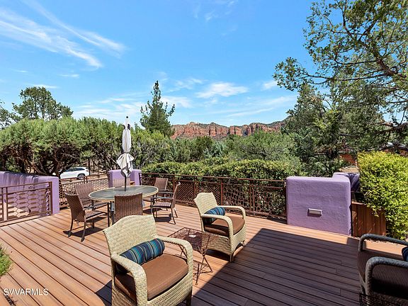 A Gem Nestled Amidst Red Rocks. Immerse yourself into the serene lifestyle that only the exclusive Oak Shadows subdivision can offer, located in the coveted Village of Oak Creek in Sedona. Built in 1998, this impeccably maintained home boasts a spacious 2,709 sq ft of comfortable living space. Property exudes pride of ownership at every turn. With 4 generously-sized bedrooms, there's ample space for everyone. A bonus hobby room adjoins the master suite, perfect for creativity or a private retreat. The 4th bedroom doubles as a functional office space, complete with its own entrance. As you step inside, witness a harmonious blend of Southwest charm and contemporary flair. Tall ceilings give the home an expansive feel, and large windows usher in an abundance of natural light, making the interiors light, airy, and welcoming. The Arizona room is a bonus space, celebrating Sedona's beauty year-round. Step outside onto the beautifully designed patio, where meticulous landscaping sets the backdrop for relaxation or entertaining. Beautifully designed custom-made metal doors & fencing. From both inside and outside, feast your eyes on the iconic Red Rock views that Sedona is celebrated for. Bask in the peace of mind, knowing the exterior has been recently refreshed with new paint & the roof has been re-coated, ensuring longevity and curbside appeal. While many places are transforming into transient hubs, this neighborhood holds true to its roots. A 30-day minimum rental policy is in place, this ensures that Oak Shadows remains a haven for residents. It's a genuine community where neighbors know and care for one another. The chance to own a piece of Sedona's finest real estate, with a balance of modern amenities and nature's beauty, awaits you. 455 Montazona Trail isn't just a house; it's a lifestyle. Experience the best of Sedona living. Your new journey begins here.