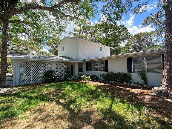RARE 2-story, pool home with 0.37 acre on a quiet street in South Venice -- just a few minute walk to the fishing pond! Upstairs is an oversized bedroom with cathedral ceilings, large master bath with tub/shower combo, a GREAT BIG walk-in closet, and even extra office space! Has new roof and mini-split a/c, and could be a separate apartment, since it has a private entrance, via outside stairs and balcony, but also has an inside stairway down to the laundry room with extra sink. Downstairs is the bonus game room (including a pool table!), two bedrooms, full bath with tub, kitchen, dining room and living room, which leads to the HUGE backyard of four lots surrounded by wood fence. Also newer water heater and water softener system. Sit outside in the caged pool, by the hot tub or the backyard campsite and enjoy the sounds of all the wildlife -- plenty of squirrels (even flying ones!), rabbits, owls, hawks, and a bald eagle have been known to pay a visit! Many cars can fit on the wide driveway and inside the carport, with an enclosed tool shed.