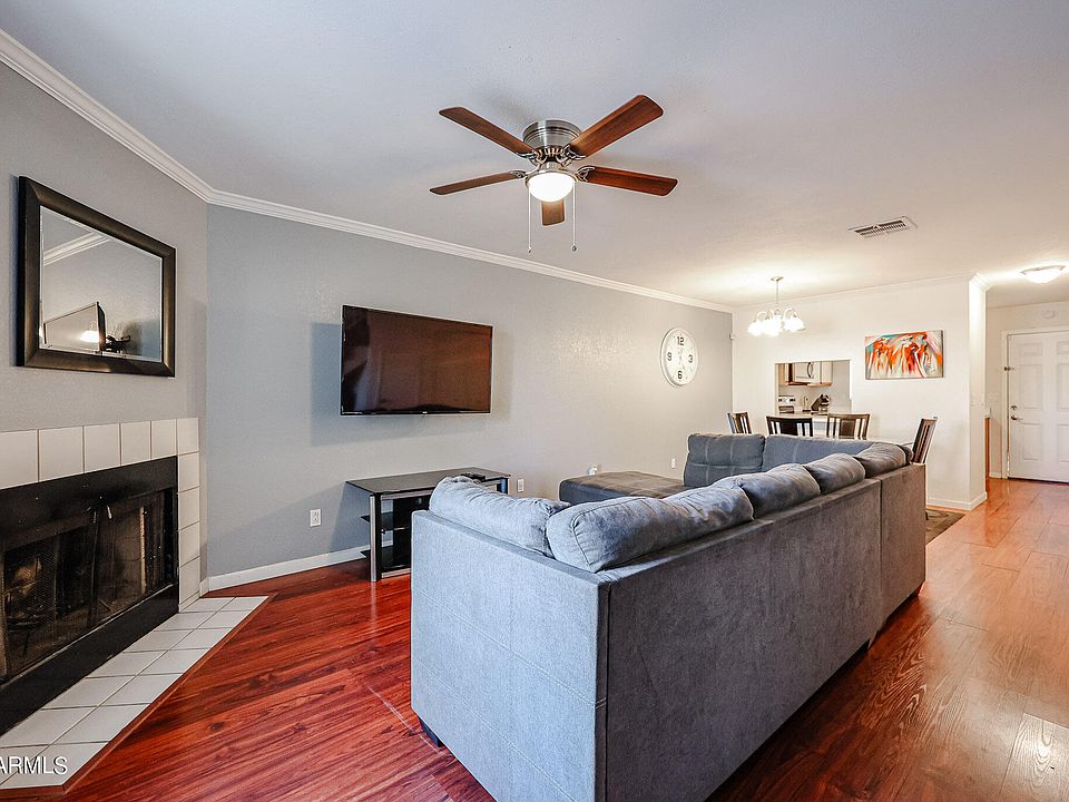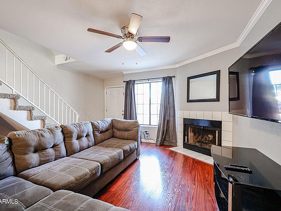 Townhouse style. NEW AC June 2023 with Nest Thermostat!! First floor features laminate flooring, wood burning fireplace, 6 panel doors, crown model, soothing neutral paint and half bath. Kitchen features stainless steel appliances and pantry. Fridge stays. Washer & Dryer stay and is located inside the unit by the dining area. Upstairs has 2 bedrooms, 2 full bathrooms, vaulted ceilings and spacious closets. Gated Community with easy access to the 60 and loop 101. HOA includes water, trash, pool, common area.
