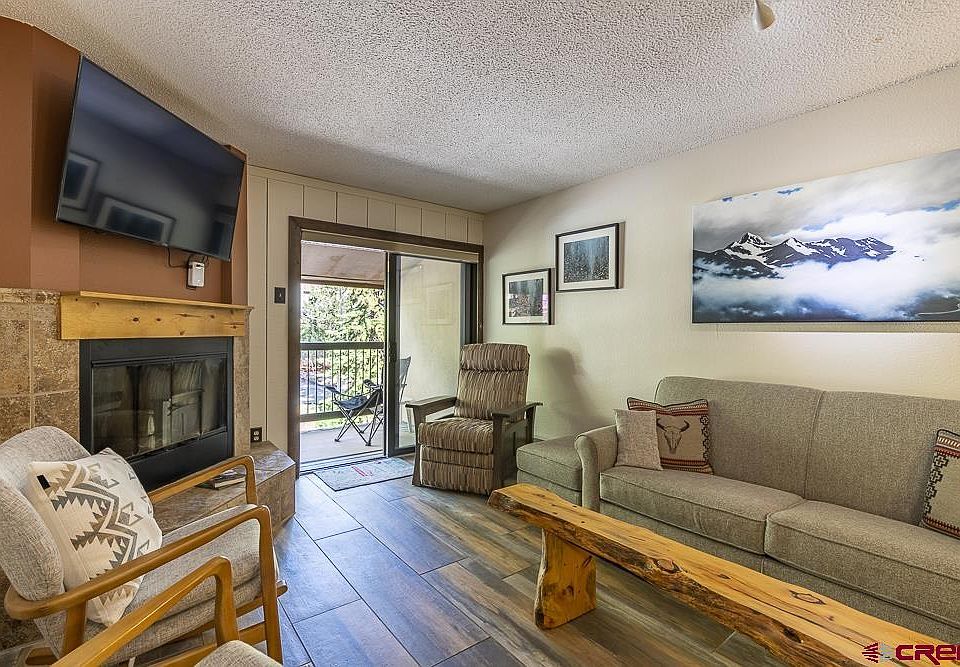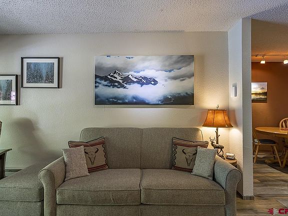 Stunning two bedroom / two bath condo on the top floor of the historic Angel-Haus community, celebrating fifty years at the base of Purgatory Resort in 2022. This fully updated move-in-ready condo is located on west side of the building, with abundant natural light. Perfect for sunning on the balcony aprs ski looking up Lower Hades ski run on winter afternoons. The balcony has a propane grill. There are custom tile floors throughout the condo and ceramic tile floors in the bathrooms. The living room has a Heatilator wood-burning fireplace with glass doors and a pull-out new queen sofa bed. The kitchen appliances include a range/oven, refrigerator, dishwasher, wine cooler, microwave, and countertop toaster oven. The master bedroom has a king-size bed that could be converted into two twin beds. The guest bedroom has a custom-made queen over queen adult bunk bed with a twin adult trundle bed that pulls out and sleeps a total of 5 people. Each bedroom has an en suite bathroom that was updated in 2017/18. The Angel-Haus has a newly renovated Spa Facility. The condo is accessible with only two steps to the hallway landing from the south entrance, or two flights of stairs from the north entrance. Condo includes a secure locker in north access that holds up to five pairs skis/poles. Walk from the ground floor locker is less than 150 yards to the six-pack chair at the base of Purgatory. HOA Fees include water/sewer, trash, TV, internet, common area maintenance, snow removal, firewood and professional management. The unit is Owner Occupied, has not been used as a rental, and is in excellent condition. This unit is not subject to the mandatory DMMA 2% member fee but a new owner can join the mountain association club.