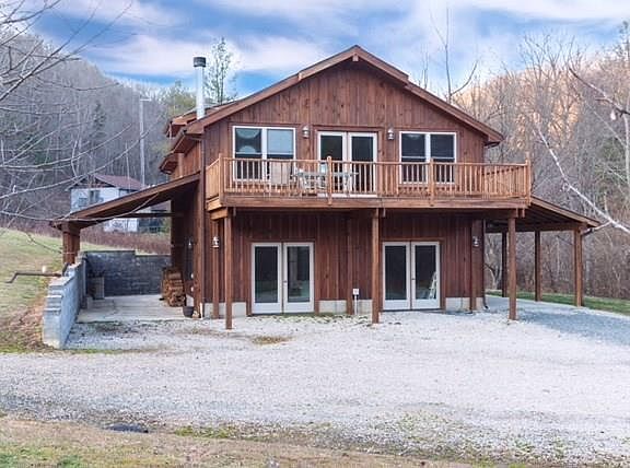 Unique home sitting on 3.75 +- acres with 2 bedroom, 1 bath , views, flat land, brook and close to town. This home has been newly stained in 2018. Inside is all wood with hickory floors, pine walls, wormy maple bar, cabinets are pine with hickory trim and vaulted ceiling. Main living area is on the second level with an open living room/dining combo, nice size kitchen, and composite deck off of this level. There are two attached carports, metal roof and an extra bunk room downstairs. Large basement is currently being used for storage and laundry but could be finished. This home has been a favorite for rentals. Must see property!!