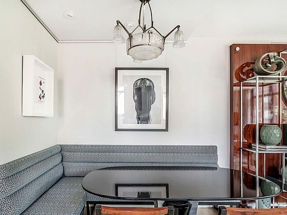 The customized open kitchen in the residence features rosewood cabinetry, crown moldings, marble countertops, and state of the art Wolf and Sub-Zero appliances - while overlooking the spacious, south-facing living and dining area with southern light and views down to the quintessentially charming 20th Street below.
