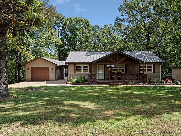 Nestled in tall trees on a 1 acre lot this home features a cozy cabin feel with vaulted knotty pine ceilings and updated finishes throughout. The kitchen offers newer stainless-steel appliances, granite countertops, and a hallway pantry for additional storage. The spacious den is filled with natural light and provides access to tiered decks, including a covered screened deck with privacy shades. Fresh interior paint, a large fenced yard, and a front porch add to the appeal. Below the home is a cement slab area ideal for storage or a safe room. A separate garage next door includes a kitchenette and full bathroom. Located in Flint Ridge, a 7,000-acre gated community along the Illinois River, residents enjoy private river access, boat ramp. clubhouse, restaurant, golf course and more.