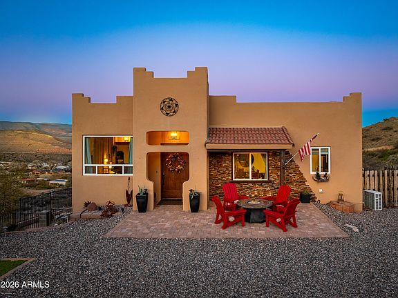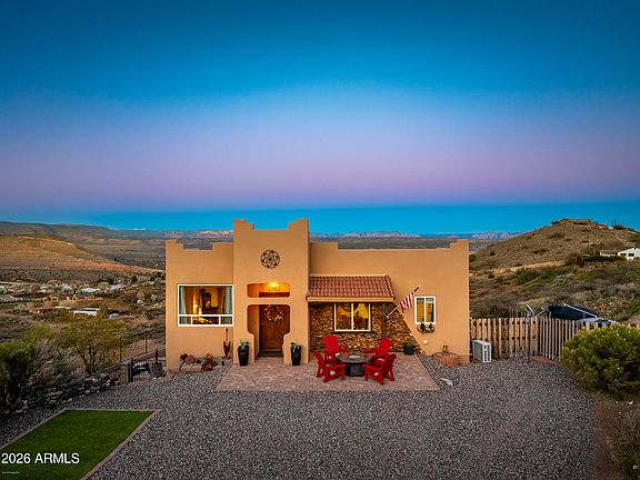 This one-of-a-kind, solidly constructed hillside home overlooks historic Clarkdale and offers unobstructed, panoramic views of the Verde Valley. Situated on 2+ acres with no HOA. The property features steel 2x4 and 2x6 framing and a durable metal roof. The main residence provides two levels of living space with four bedrooms, two living areas, and two dining spaces. The well-appointed kitchen includes gourmet features and an espresso bar. Additional highlights include a wine cellar, an expansive fenced lower-level outdoor living area, and an upper balcony designed to capture the valley's most commanding views. The bonus detached shed/casita 12x24 offers a private driveway, a full bath, and a kitchenette. Storage shed 12x30. The home is being sold furnished as shown (excluding wine and select storage items), making it a turnkey second home, vacation retreat, or income property.