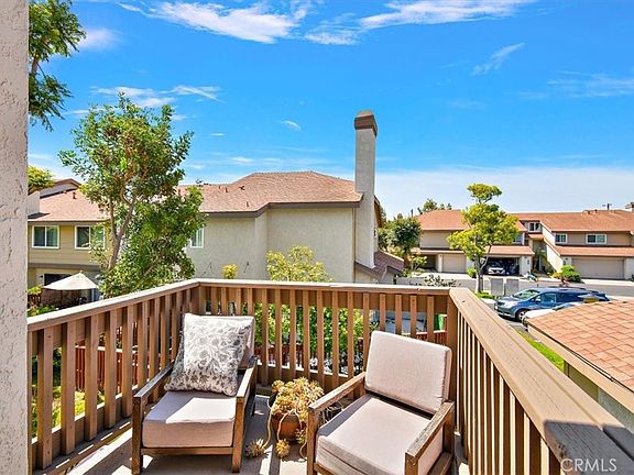 A large front deck leads you to this gorgeous upper end unit. 2 bedrooms and 2 bathrooms in desirable well maintained Tannenwood gated community. Open floor plan with vaulted ceilings. Spacious living room with cozy fireplace. The remodeled kitchen features white shaker style cabinetry with soft close doors & drawers, quartz counter tops, Calcutta marble tile backsplash, stainless appliance, brush nickel faucet & recessed lighting is open to the dining room. Large dining area with a slider door to private balcony overlooking the lush grounds, mature trees, and the community pool. The spacious primary bedroom features Vaulted ceilings & updated ensuite bath with a walk-in shower, attractive porcelain tile shower surround with glass tile accents and stone tile shower floor, white vanity, quartz countertop, updated faucets & fixtures & framed mirror. The remodeled hall bath features updated vanity, quartz countertop, framed vanity mirror, updated faucets & fixtures, and attractive porcelain tile tub/shower surround with glass tile accents. Convenient inside laundry facilities, Samsung washer/dryer included. Dual pane vinyl windows and sliding door. Accessible Beige paint, plank wood look porcelain tile flooring and tall baseboards throughout complete this move-in ready home. Attached one car garage with adjacent covered carport right below the residence. The resort like Tannenwood community offers a community pool, spa, clubhouse, lush landscaping, and ample parking for residents/guests. HOA includes trash and flood insurance. Fantastic centrally located neighborhood within proximity to shops, restaurants, parks, golf courses, schools, energetic nightlife, cultural amenities like the Artist's Village, Heritage Museum of Orange County, the Santa Ana Zoo, Little Saigon and more. Easy access to freeway. Garden Grove School district. Walking distance to Rosita ES (K-6)