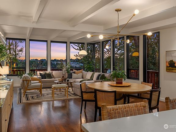 Experience tree house tranquility in this architectural one-level mid-century modern gem in coveted Pigeon Point. Its minimalist design seamlessly integrates w/ nature, offering stunning bird’s eye territorial & sunset views. Bask in natural light flooding through walls of windows & skylights, enhancing the open concept living area w/ cozy FP & stunning kitchen. Step outside to expansive decks for alfresco dining, embracing the seamless indoor-outdoor flow. 3 bedrooms, incl. a spacious primary suite, office nook, W/D, 1-car gar w/ 200 sq. ft. bonus room all on 1 level. A sep. guest suite/4th BD downstairs allows multi-generational living or added income pot. Located min. from DT Seattle & the vibrant West Seattle Junction. A rare offering!