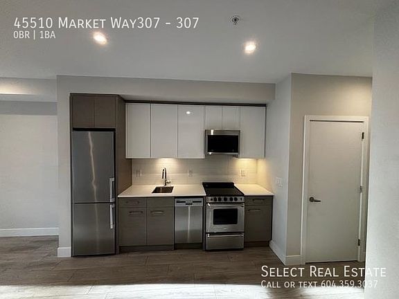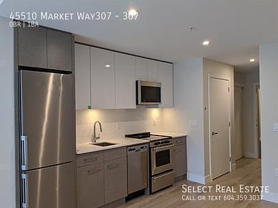 Address: 307 - 45510 Market Way, Chilliwack, BC V2R 6E1 Date Available: April 1st, 2025 Description This stunning, brand new, studio apartment is located in the brand new Garrison Central. Walking distance to Garrison village for shopping, restaurants and groceries. Or go right across the street to Cheam Leisure Center. The unit features a modern kitchen with stainless steel fridge, range, dishwasher and over the range microwave. Ample storage in the cabinets and stylish under cabinet lighting. The home features a spacious balcony with beautiful views of green space. Lease Details Lease duration: 1 Year Deposit: Months Rent. Pet Deposit: Months Rent if Applicable No Smoking Property Details Bed: 0 Bath: 1 SQFT: 450 Pet Details Pets(Yes/No): No Type Allowed: None Number: 0 Size Restriction: None Exterior Details BBQs allowed(yes/no): Yes Parking type and how many: Underground Parking (1) Yard Usage: N/A Yard fully fenced: N/A Shed Or Shop Usage: No Appliances Included Fridge: Yes Range: Yes Dishwasher: Yes Microwave: Yes Washer/Dryer: Yes Shared Laundry: No Pay Laundry: No Fireplace: No Air conditioner: Yes Standalone freezer: No Utilities Gas: N/A Hydro: 100% Tenant Internet/Cable: 100% Tenant Water, Sewer, Garbage: 100% Landlord Utility Type Heat Source: Baseboard Septic/Sewer: Sewer Water Source: City Tenant Responsible for Septic pumping: No Strata Age Restriction: NA Storage Locker: No Move-in/out Fee: $150 Move In Move in Scheduling: 48 Hrs Notice (Moves booked between 9am-9pm M-F OR 10am-8pm Sat/Sun/Stat Holidays)