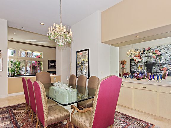 Live like a TENNIS celebrity in a small enclave of 19 homes sharing 2 private regulation tennis courts. Phillip Manual designed this home with casual luxury in mind & to display the owner's art collection. The main entertaining area has a wet-bar and features dramatic 14' high walls, with pool and WESTERN mountain views. The formal dining room has a built in serving area. The chef's kitchen is complete with Gaggenau, Wolf and Sub Zero appliances, and enveloped by the rich tones of warm African mahogany cabinets. The flow from the kitchen into the great room is seamless. On the opposite side of the house awaits a dreamy master bedroom with fireplace, HUGE dual closets and attached office. Each bedroom has its own private full bathroom. The 3rd car garage is currently being used as a home gym. The backyard is a tranquil retreat, with the pool as a main focal point. Beyond the high shrubbed yard are the tennis courts, clubhouse and BBQ area. Furnished subject to inventory.