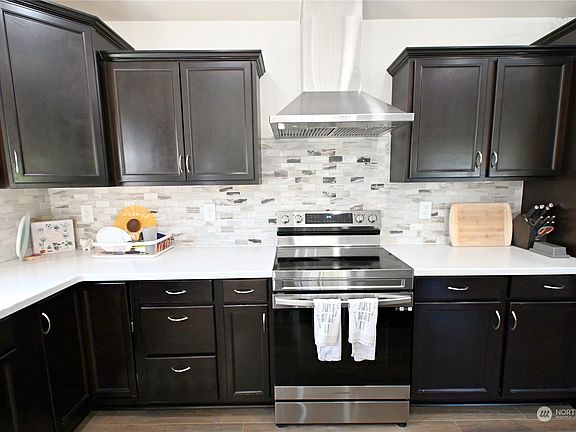 This beautiful stick built handcrafted home features three bedrooms, two full baths, and an attached two-car garage. Its open-concept design seamlessly integrates the dining room, living room, and kitchen featuring a stylish island and solid surface white quartz countertops. Abundant storage with a pantry, laminate flooring throughout. The primary suite offers a spacious walk-in closet and a generous bathroom. Ample windows provide abundant natural light and showcase views of the Cascade Mountains. Fully fenced backyard with a patio ready for great summer BBQs. Situated within walking distance of Silo Park and downtown Concrete. Additional features include a heat pump, and no HOA fees. Come, make this charming home yours today!
