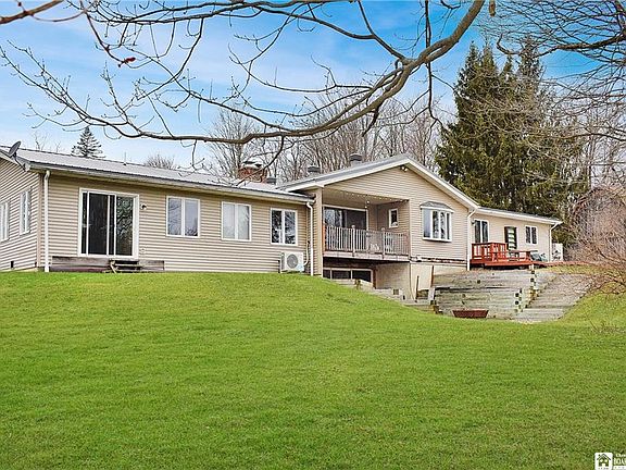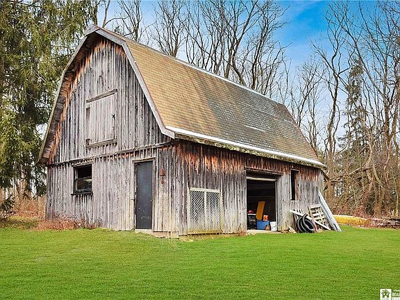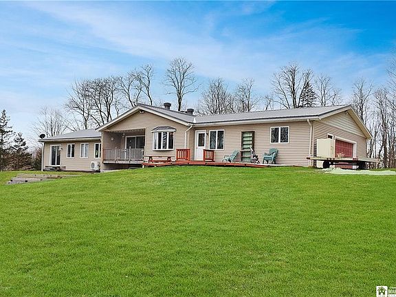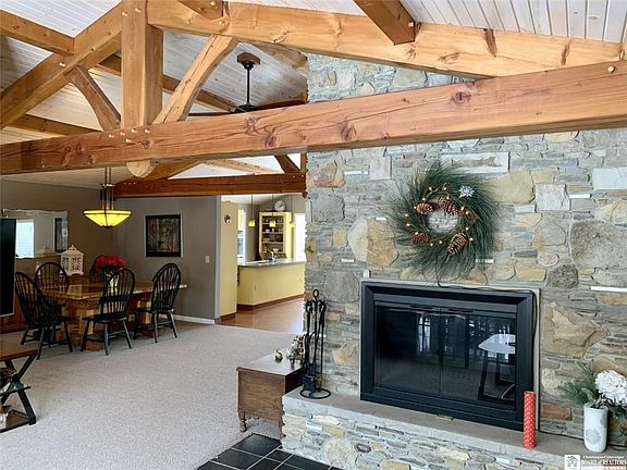 Private country setting in Bemus Point. Stunning post and beam timber frame construction with vaulted ceilings and an open floor plan.The master suite includes a private tiled bath with separate shower and whirlpool bath plus a bidet. A small room off the bath is currently utilized as a laundry room and can be relocated back to the mud/laundry room off the kitchen, then this space can be a walk-in closet,office or even a nursery. The other 2 bedrooms are split by a shared bathroom and each bedroom has its own sink. The stone wood burning fireplace is 2 sided to be enjoyed from the living room or kitchen area. The balcony off the back is sure to calm the soul. A unique family room downstairs is open to the rear yard and features a rustic metal ceiling a gas fireplace, radiant heated floors and a dry bar. The 2 story barn provides lots of storage and is suitable for animals. It has electric service and 2 overhead doors.
