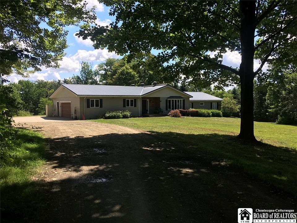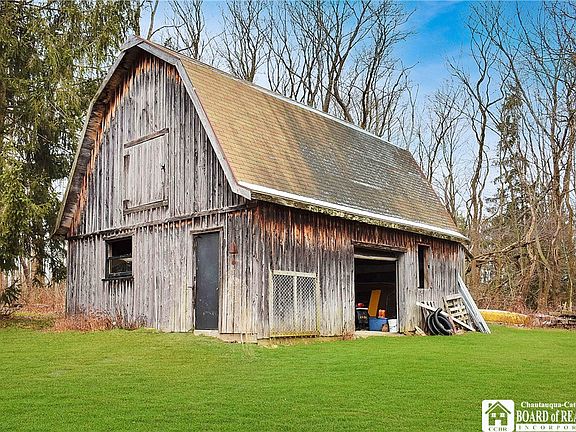 Private country setting in Bemus Point. Stunning post and beam timber frame construction with vaulted ceilings and an open floor plan.The master suite includes a private tiled bath with separate shower and whirlpool bath plus a bidet. A small room off the bath is currently utilized as a laundry room and can be relocated back to the mud/laundry room off the kitchen, then this space can be a walk-in closet,office or even a nursery. The other 2 bedrooms are split by a shared bathroom and each bedroom has its own sink. The stone wood burning fireplace is 2 sided to be enjoyed from the living room or kitchen area. The balcony off the back is sure to calm the soul. A unique family room downstairs is open to the rear yard and features a rustic metal ceiling a gas fireplace, radiant heated floors and a dry bar. The 2 story barn provides lots of storage and is suitable for animals. It has electric service and 2 overhead doors.