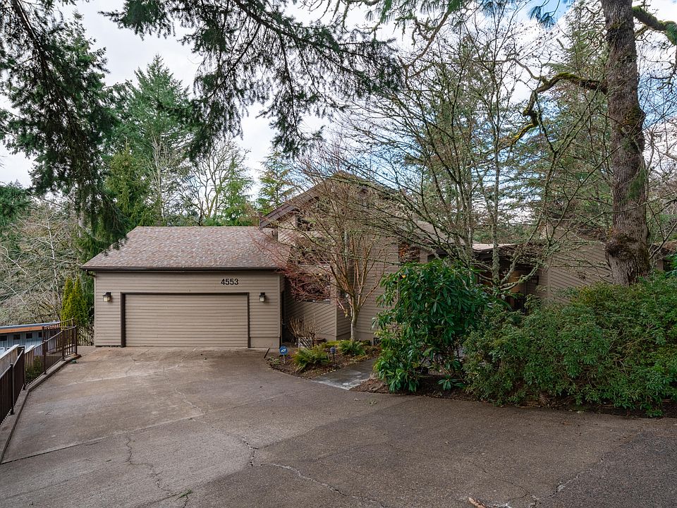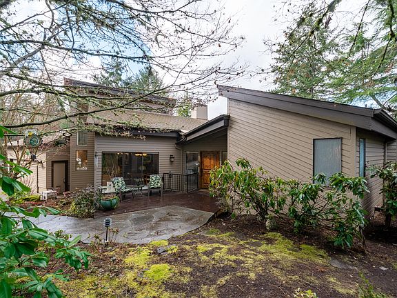 Sunnyridge Heights! 3 level custom contemporary nestled amidst tall trees on .36 ac lot. Soaring vaulted ceilings, floor to ceiling windows, architecturally designed copper clad frplc divides the LR & FR. Fully applianced kitchen w/quartz countertops; formal DR; Primary BR on main floor w/sliding glass door to private deck. Open stairway to upper loft – perfect for library or office. Lower level w/rec rm, wet bar & potential for 4th bdrm; Newer FA gas, CAC & gas water heater. Auto sprnklrs & water feature!