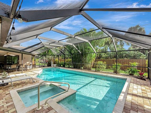 Under contract-accepting backup offers. Imagine living in this beautifully renovated home on the quiet end of a dead-end street in a community with LOW HOA fees and NO CDD, and a fabulous location??? Does it get any better, why YES it does, the new and paid off Solar Paneled roof promises nearly non-existent electric bills. Hurricane IMPACT windows and sliders, NEW stainless-steel appliances, FRESHLY painted interior, and NEW luxury vinyl flooring for easy care. Enjoy upgrades of a Kinetico water purifying system (Water that tastes better, works better in your plumbing and appliances, makes skin and clothes feel better and saves money), well irrigation system, stainless-steel appliances, central vacuum, paved deck and more. This charming home is full of bonuses with its' split floorplan to accommodate friends and family together time or me time. An extensive ROGUE home gym setup including treadmill, air bike, free weights, punching bag, barbell set with rack and bench and more, conveys with winning offer and is a MUST SEE...cancel that gym membership!! Most compelling is the VIEW of the re-surfaced and heated pool and spa with spacious deck overlooking LUSH, tropical landscaping. Are you a golfer? If yes, wonderful, enjoy the neighborhood Bent Tree 18-hole golf course, if not, great, the course membership is purely optional! Meanwhile you are awarded the flexibility of a multitude of public and private county-wide Golf Clubs, of which to become an exclusive member or play as time permits you. Downtown and beaches are 20 minutes away, I-75 is 7 minutes, Rothenbach park is 3 minutes, Publix is 2 minutes, nearby restaurants, churches, and shopping are also in very close proximity. The Classical Academy has recently relocated to its' new campus which is also only 2 minutes. Bottom line is that you can not go wrong in this home, in this location.