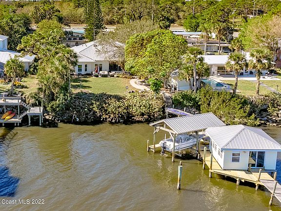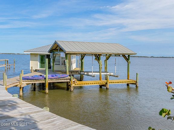 Direct Riverfront on Indian River deep water, no HOA.. plus BONUS adorable BOAT HOUSE PLUS the dock and lift, an extraordinare opportunity for FUN! 3 bed, 3 bath open floor plan from entry to back yard! Metal roof, vinyl siding, all IMPACT windows except porch. Kitchen is granite and SS appliances, also gas stove! Huge pine ceiling screen room for year round entertaining! Big back yard with tropical plants, walkways, Mango tree & big storage shed and shower, too! (2003 complete remodel from slab). Great location between Eau Gallie & Pineda Causeways make easy access to I-95 and the beaches! Great area for golf, schools, restaurants and shopping! Prime views for our space launches! Don't pass up this one with the beautiful views of the river, sunrises, sailboats and dolphins