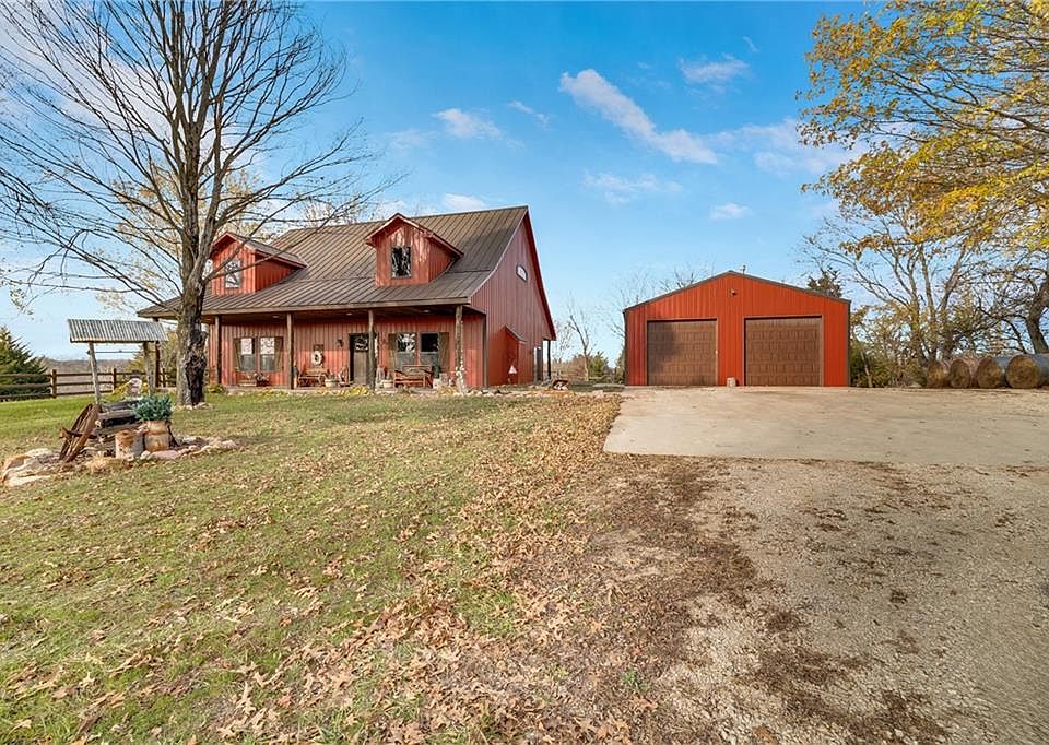 This picturesque home offers the perfect blend of rustic elegance and modern conveniences. Nestled amidst serene surroundings, the bright red exterior with a barn-inspired design immediately captures the eye, complemented by lush greenery & a charming fenced yard.  Step inside to be greeted by an open-concept living space, showcasing soaring ceilings with rich wood beam accents. The kitchen is a true showstopper, featuring custom wood cabinetry, a sleek granite island, & modern stainless steel appliances. The seamless flow into the dining & living areas makes this space perfect for entertaining or relaxing by the fire. Spacious & uniquely designed bedroom offer plenty of natural light, pelt stove for extra comfort, & personal touches that bring charm and warmth. The bathroom exudes spa-like luxury, boasting a freestanding tub, walk-in tiled shower, walk in closet that doubles as a storm shelter. Every detail is carefully curated to provide comfort & charm. A thoughtfully designed laundry room includes custom cabinetry & a stacked washer/dryer setup, with convenient outdoor access. When you go up the custom staircase you will find 2 spacious bedroom with palet flooring & plenty of closet space to meet all the needs. Outdoors, you’ll find ample space perfect for gatherings, relaxation, or enjoying nature. The large covered patio provides a perfect space for outdoor entertaining or simply enjoying the surrounding nature. The oversized garage offers third bathroom, separate laundry, ample storage for vehicles, tools, & equipment, with organizational systems in place for added convenience.  The property is surrounded by scenic views of rolling fields & trees, providing privacy & tranquility. Horse round pin & outbuilding with stalls & a lean-to. The pond is just a added bonus to this beautiful property. This property has it all. Don't miss the opportunity to own this countryside gem! Schedule your private tour today!
