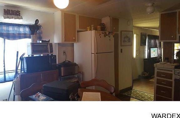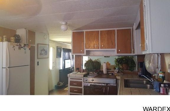 Beautiful 2 bed/1 bath manufactured home located on a large cleared acre property with wonderful views of the mountains. Both rooms feature carpet, but will need new carpet. Vinyl tile in the bathroom. Then, laminate flooring throughout the home. The gas furnace serves as heat in the winter time and the wall A/C units for the summer. The living room is nice and cozy, with enough space to get comfortable. There is also enough cabinet space in the kitchen. Per the Seller, the last time it rained, some rain came in through the evap vent and the condition of the evap cooler is unknown and never had a plumbing issue. Moving onto the front yard, the covered patio is a great spot to enjoy the early mornings or late evenings, and the fenced front yard is also great for the pets to enjoy. This property also features a tool shed with power and a nice size unfinished utility building that houses the laundry room and a half bathroom. There is two underground 1,500 gallon tanks that serves as the main water source for the house and a pump house. There is a water line on the street that the home can be connected to if desired. Property is sold in As-Is condition.