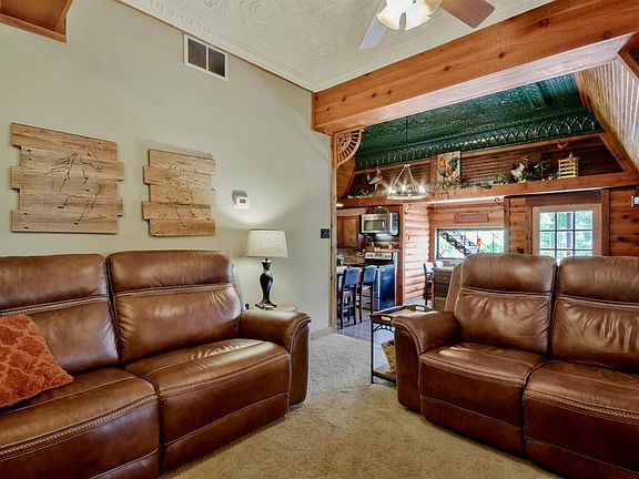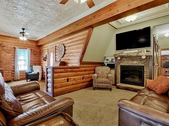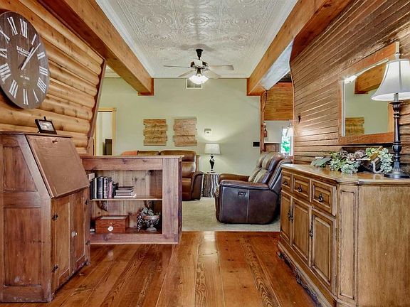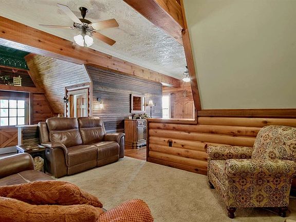 Must see! This gorgeous property on 6.1 acres is located just off of Highway 54 on the east side of Kingman. Just 30 minutes from west Wichita. This unique home shows a tremendous amount of pride in home ownership and attention to detail with custom interior work, including cedar log interior wood, antique stamped metal ceiling and hand stamped copper facing on kitchen cabinets. This home includes three bedrooms with the potential opportunity for a fourth bedroom in the finished area of the basement that includes a door/egress window. The main floor features a large, beautiful, fully updated open entry kitchen/dining room with stainless steel appliances and eating bar, living area, full bathroom, two bedrooms and a main level laundry room. The wide staircase includes a power chair lift. Upstairs you'll find the master suite with a fully remodeled bathroom including a custom oversized shower and a private balcony overlooking breathtaking views of trees and water. On the upper level there is an extra room for an office. As you head outside, the views are continuously amazing. The lake fed pond features a bridge, including lots of wrought iron fencing, deck rails and gazebo. You will enjoy the beautiful outdoor seating area with a stone fireplace and hot tub all with more views of the water and surrounding wooded areas. This property also features 2 sheds, with one serving as a workshop and a custom designed barn to complement the home. The barn includes additional garage space. There have been so many updates during the sellers ownership. Some of these updates include, newer sump pump, newer stainless steel kitchen appliances, backsplash, countertops, new lighting, sink, faucet, painted cabinets, garbage disposal, water heater, gas living room fireplace, newer Lennox HVAC unit and a newer water softener. Double throw generator, is included with the property. Other recent additions include, a setup for horses including a lean to with tack room, wood fenced pasture and round pen. The exterior barn and home have been freshly pressure washed and stained. You don't want to miss seeing this beautiful property!