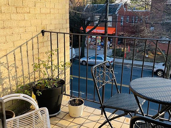 Close in and 10 minute walk to Georgetown and the university, C and O Canal and minutes drive/bus to downtown (bus stop near front door of building). Fully renovated, top floor, (3 story building) corner unit with balcony and FREE, RESERVED parking space. Light and airy with natural light and openness throughout. The large bedroom has picture window and walk-in closet. Spacious open floor plan includes light drenched living room and dining room with kitchen/bar opening. Recessed lighting with dimmers creates a cozy and dramatic ambiance. Bathroom has ceramic tiled shower with European fixtures. Delightful kitchen with granite counters and stainless steel appliances. The balcony is ideal for light grilling with space for table and chairs. Storage bin and bike room storage are included as are ALL UTILITIES. ALL UTILITIES AND FREE RESERVED PARKING SPACE