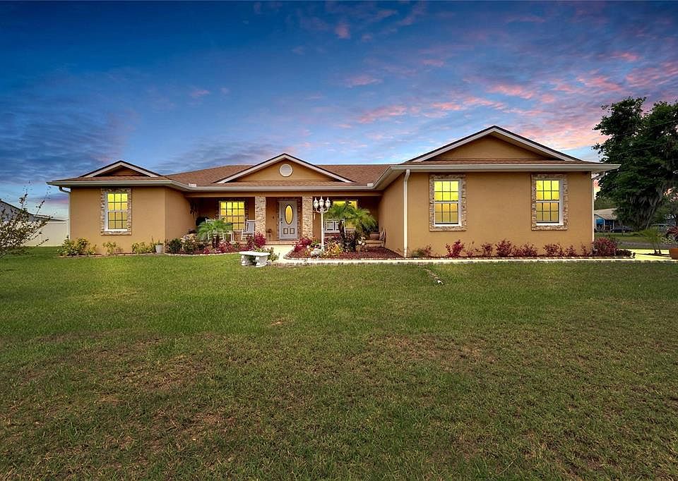 NO HOA or CDD. Immaculate, custom-built home located in an ideal location of the quiet country while close to shopping, restaurants, and medical centers. The special care by the original owners is evident throughout and includes unique features that can only be found in a well-planned home starting with custom exterior stone accents and the large front porch to take in the views of the country. Step inside and appreciate the pristine space with easy-care flooring, high ceilings, and neutral finishes. The large Great Room flows effortlessly into the Dining area and the Kitchen and features a breakfast bar, granite counters, an abundance of soft-close cabinets and drawers, coffee bar, and smudge-proof slate appliances including a double oven. The primary bedroom suite is adjacent to the Dining area and includes a spacious bedroom with a walk-in closet and bath that connects to the laundry room. This also leads to a small foyer from the garage and back into the kitchen. A very smart design! The remaining secondary bedrooms share another full bath with high-end finishes. Outside you'll enjoy the screened lanai with views of the oversized, fenced yard with a double gate to park a boat or small RV, fruit trees, and a shed that stays with the home. Even the garage has been given special attention with epoxy floors, windows for natural light, and an attic with stairs and extra storage. Thank you for your interest and for taking the time to see this home in person.