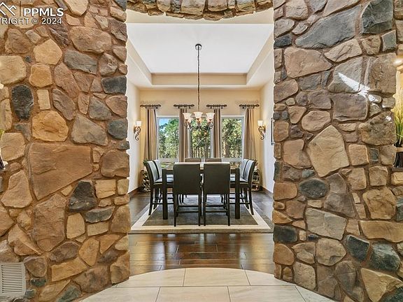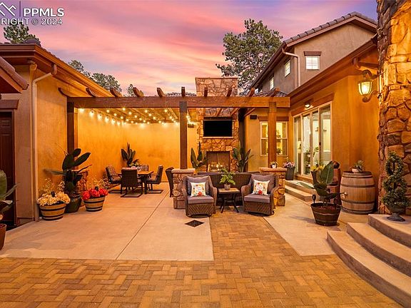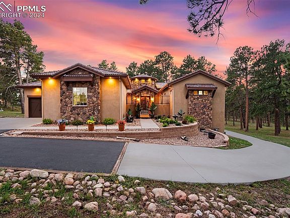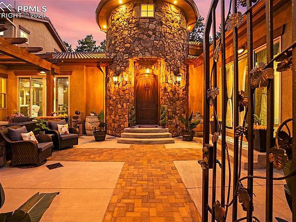 Stunning Napa inspired home nestled on 2.78 acres of trees and meadows. Old World Charm and endless upgrades make this home perfect for the discerning person that appreciates style and comfort. Be greeted by the inviting courtyard that leads to the architecturally stunning turreted foyer. The gourmet kitchen features the finest granite slab counters, custom cabinets and Thermador Pro appliances. The kitchen overlooks the dining area and living room, making a perfect flow for entertaining. The great room boasts soaring ceilings, floor to ceiling stone fireplace and walks out to the covered deck. Enjoy entertaining in the elegant dining room. The luxurious primary retreat offers a walk-out to the courtyard, 2 closets, dual vanity, soaking tub, custom tiled shower and heated floors. The 2nd main level bedroom is just steps from a bathroom and provides a private deck – an ideal office or bedroom. The walkout lower level is crafted for entertainment and opens to a spacious family room with custom wet bar & wine cellar. Enjoy hosting Movie Night in the home theater. A suite with private bathroom plus two bedrooms that share a jack and jill bathroom offer plenty of space to comfortably host family and friends. The flex room can be a gym or home office and provides an adjoining bathroom with steam shower & rain head. You will be captivated by the spectacular out-door living spaces offering over 1500 sf of private decks, patios and courtyard with fireplace, pergola, mounted TV and party lights. Relax and star gaze from the hot tub. The fire mitigated property is the perfect blend of trees, meadows and privacy. With the 4-car garage, two storage rooms, two furnaces & central air, custom blinds, upper & lower laundry, newly paved driveway & concrete driveway to back yard, the amenities of this home are truly special. With easy access to HWY 83, you can leave the world behind with this one-of-a-kind retreat offering all the conveniences of living in the city just moments away.