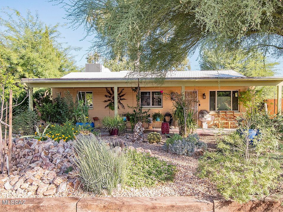 Mid-Century Modern Home in mid-town Tucson featuring: upgraded kitchen with raised cabinets, granite counter tops, glass backsplash, and stainless appliances, large formal and family rooms with lots of natural light, double pane windows, Hunter Douglas blinds, hand textured walls and ceilings, designer light fixtures and recessed lighting, 18' porcelain tile throughout entire home, master suite with custom bathroom-tiled walk-in shower, rain showerhead, enormous walk-in closet with shelves, guest bedroom has a separate entrance and patio sitting area. Enjoy the peaceful and mature landscaping in the front and backyard while sitting on the full length north or south patios. This home has been wonderfully maintained and is a must see!!!