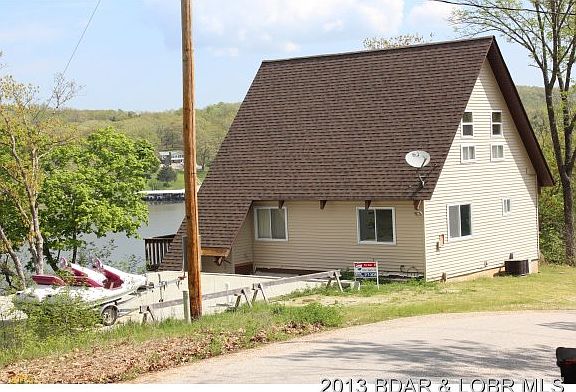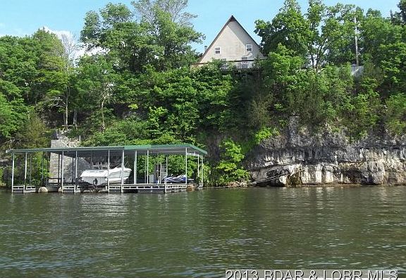 Darling A-Frame perched on some beautiful limestone out croppings abutting the calm waters of the Little Niangua. Panoramic viewing awaits from the lofty sun deck accessed from the vaulted ceiling living room displaying huge beams and tongue and groove ceilings. Wood stove will warm up all the upstairs too! Dining area is open to the convenient kitchen with Frig, Stove and Dishwasher. Main level bedroom is complimented by a real large closet. Open stairway accesses the spacious balcony loft which is also used as a second bedroom and offers up lots of space if you need a small office/computer room. The walkout lower level, with room for a third bedroom, accesses a screened patio area, courtyard area & stairs to dock.