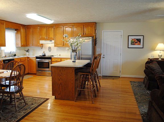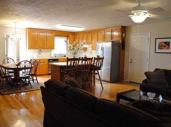 Very livable, attractive, and open floor plan. The Great Room is a large, comfortable room featuring: living room seating, dining table area, large kitchen area with oak cabinets and a large kitchen island,and oak hardwood floors that are beautiful! A large Master Bedroom w/dressing area and private bath and 2 additional good-sized bedrooms with hall bath complete the first floor. The kitchen door opens to a 10x12 deck that overlooks the flat back yard. Brick-to-grade with vinyl trim exterior plus 24x6 wooden front porch. Very tastefully decorated throughout, the basement has a brick fireplace w/ gas logs. There is even a full bath w/ a jetted tub! This home has had many updates throughout since 2009 - Up-to-date and ready to move in! There is a 2-car attached garage with laundry room