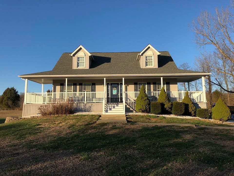 Cape Cod style home with half wrap around covered porch. 3 bedrooms, 2.5 baths. Main level Master bedroom with large walk-in closet. Extra large Living room (with new carpet), kitchen with pantry and all brand new stainless steel appliances. Two large upper level bedrooms with walk-in closets, plenty of storage. Finished basement, with walkout basement/garage. All on 1.43 acre lot with privacy. Address is 456 Echo Trail, Brandenburg Ky.
