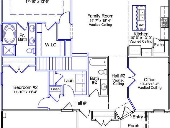 The one-and-a-half-story Carson plan has three bedrooms and two full bathrooms. Upon entry, you will find an office with vaulted ceilings. This split-bedroom home features a great room with a gas log fireplace, that is open to the kitchen with upgraded white cabinets with Linen colored granite countertops, a corner pantry, a center island, and an eat-in kitchen. The primary bedroom features a boxed ceiling and is separate from the secondary bedrooms, it overlooks the backyard and features a large walk-in closet. The primary bath has a shower and a large drop-in tub. Upstairs you will find a large guest bedroom with a full bath. Relax outside under the covered porch and enjoy the weather.