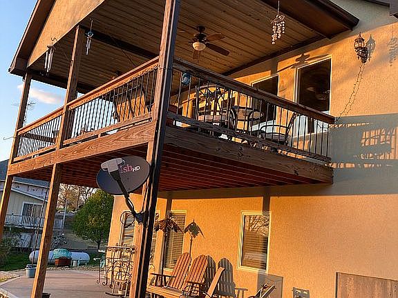 Water front home with beautiful views and sunsets! 3 bedroom 3 bath with large master bedroom and walk in closet/bath. Has tiled shower, with tiles floors in baths. The entire house has vinyl water proof floors. Open concept with custom made cabinets and large island eat in kitchen. Island and counter tops are granite. There is a bonus room above garage that is currently being used as a work shop but could be used as a bunk room if needed. Large back deck off kitchen/ living room. Their is a screened in cabana and storage shed by water. 2 stall boat dock with boat electric lifts. With attached swimming deck, with slide and spring diving board. This property is located two lots behind main channel bout, on a deep cove. We have 6 feet of water at front of boat well and 8 feet of water at back of dock where the slide and spring board is. Very good fishing and swimming.