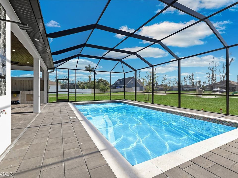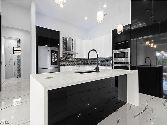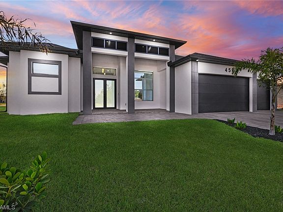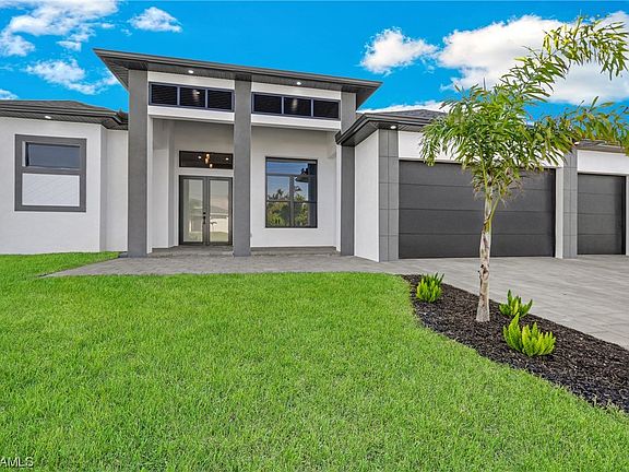Luxurious Modern Home located in Cape Coral closes to Matlacha , New Construction and loaded with every imaginable upgrade pre-wire for EV port for Tesla ,or any Hybrids cars ,. Featuring 3 Bedrooms plus a den 3.5 Bathrooms and a 3 Car Garage with an open floorplan, designer coffered ceilings, plank tile floors throughout, . Stylish modern kitchen features , waterfall center island, custom contemporary cabinetry, and high-end appliances. Spacious family room with feature wall & fireplace complimented by detailed vaulted ceilings. Designer chandeliers, fans, squared LED lighting. The owners suite feels like a private retreat with tub style with walk-in shower, and vanities. Spacious bedrooms each with unique tray ceilings. East Exposure for sunsets & afternoon sunlight on the Resort Pool with a salt system, massive sun shelf for sunbathing, and tons of LED lights in the pool, Full outdoor kitchen, grill, Huge mud set paver deck, wood ceilings, & extensive landscaping. BOATERS very close to Matlacha for wet & dry boat storage, boat rentals, restaurants, dining, events.
