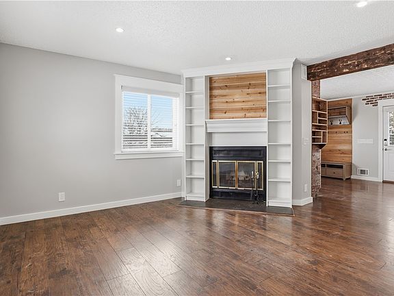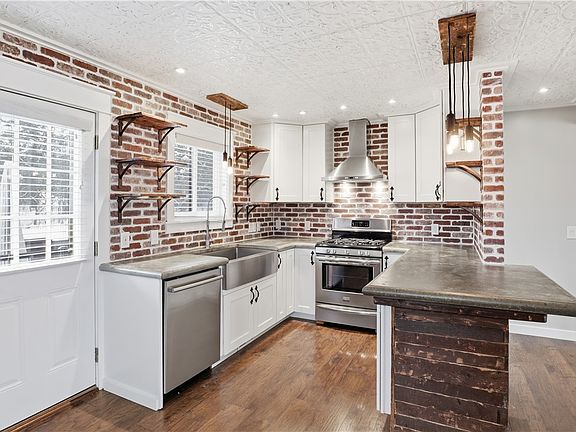 At the heart of the home is a dreamy white kitchen with solid surface concrete countertops, custom backsplash, farmhouse sink, stainless steel appliances, and eat-in bar, all open to a spacious living room with a cozy wood-burning fireplace ideal for entertaining or relaxing. Timeless neutral tones and laminate flooring flow beautifully throughout.