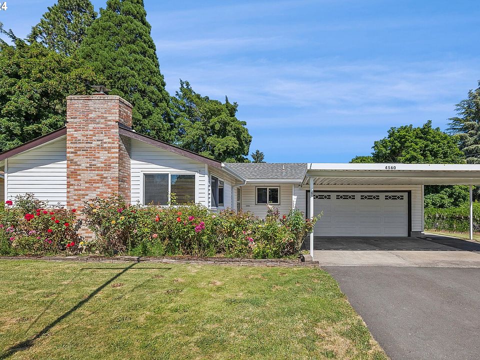 Amazing one level home on an oversized corner lot. Enter into the light filled living room with a cozy pellet stove and corner windows overlooking the beautiful rose garden. The larger of the two primary suites features a spacious walk-in closet with built-ins, bay window with a bench seat, new carpet and a walk-in shower. The second primary suite and two additional bedrooms provide versatility. Updated kitchen with an island and newer appliances is ideal for gatherings. Enjoy the incredible backyard with a composite deck, patio, plenty of space for gardening and two sheds for storage. Newer HVAC, water heater and electrical panel. Close to Intel, Nike and easy commute to Hwy 26. Location affords easy commute in any direction.